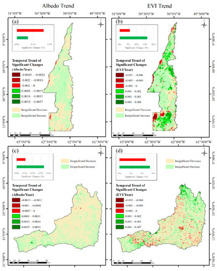 Spatial distribution of the trend per pixel in the period 2001–2016 for: (a) albedo in the Ji-Paraná River Basin (JPRB), (b) Enhanced Vegetation Index (EVI) in the JPRB, (c) albedo in the Araguaia National Park and Cantão State Park (ANP-CSP), and (d) EVI in the ANP-CSV.