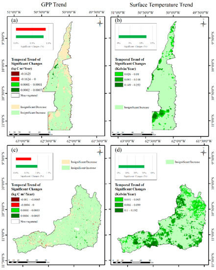 Spatial distribution of the trend per pixel in the period 2001–2016 for: (a) Gross Primary Productivity (GPP) in the Ji-Paraná River Basin (JPRB), (b) surface temperature in the JPRB (b) GPP in the Araguaia National Park and Cantão State Park (ANP-CSP), and (d) surface temperature in the ANP-CSP.