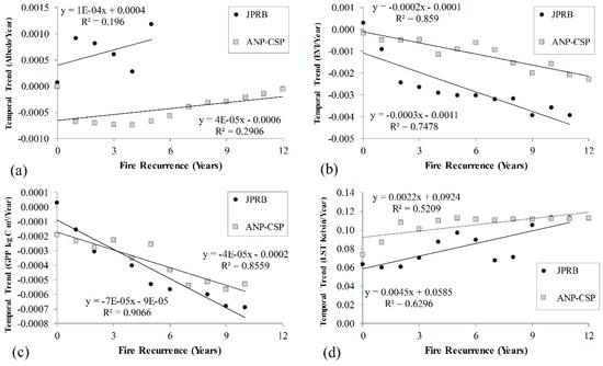 Figure 9a,d illustrate the relationship between the MODIS biophysical parameters and fire recurrence from the linear regression analysis. The significant temporal changes of EVI and GPP showed a strong relationship with the increase in fire recurrence (R2 > 0.74) (Figure 9b,c). We did not observe a significant relationship between albedo changes and fire recurrence (R2 < 0.29) (Figure 9a). The relationship between LST and fire recurrence was greater in the JPRB area (R2 = 0.62) compared to the ANP-CSP area (R2 = 0.52) (Figure 9d). However, the fire recurrence did not fully explain the variations in surface temperature.