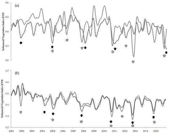 Time series of Enhanced Vegetation Index (EVI) in the Ji-Paraná River Basin, considering: (a) pastures, with four (dotted line) and eight (gray line) years of fire; and (b) Altered Ombrophilous Forest, with two (dotted line) and four (gray line) years of fire. Arrows indicate the exact dates of fires in these pixels, black arrow for dotted line, and gray arrows for the gray line.