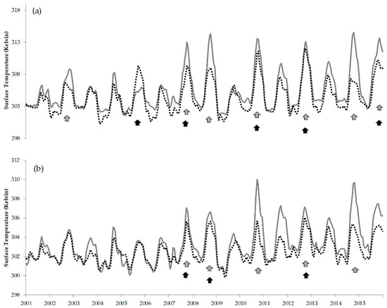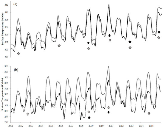 Time series of Land Surface Temperature in the Ji-Paraná River Basin, considering: (a) pastures, with four (dotted line) and eight (gray line) years of fire; and (b) Altered Ombrophilous Forest, with two (dotted line) and four (gray line) years of fire (b). Arrows indicate the exact dates of fires in these pixels, black arrow for dotted line and gray arrows for the gray line.