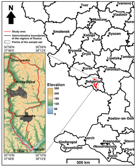 The test site is situated in the Belgorod region of Russia (Figure 1). The square size of the test site was 1560 km2. The coordinates of the corners of the study area are 50°10′ N, 37°46′ E, 50°58′ N, and 38°12′ E. Chernozems Pachic and Chernozems Albic are the dominant soils in the region. The terrain is a heavily dissected wavy-flat hilly plain. The parent materials are loess loam and clay, chalk sediments, alluvial and fluvioglacial sands, and sandy loams. The climate is continental with a hot summer and a moderately cold winter. The natural vegetation is represented by isolated oak and pine forests, meadows in dry valleys and floodplains, and calciphytic vegetation on steep slopes. However, croplands are dominant.