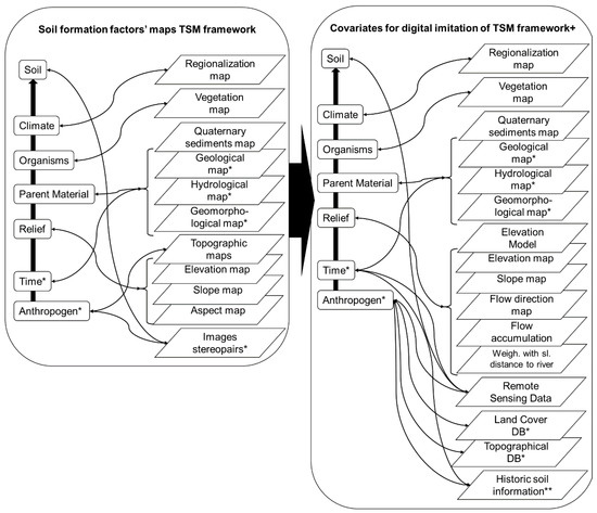 Most existing frameworks integrate only some traditional methods for soil mapping. However, the traditional process of soil mapping compilation can be imitated using the achievements of digital soil mapping. Many useful results could be obtained if the entire work process of a traditional soil mapper was imitated, including the process of soil map compilation via the cartographic methods used for covariate analysis [25]. In addition, there are approaches for incorporating expert knowledge into automatically created models, as well as extracting and transferring explicit knowledge [26,27,28].