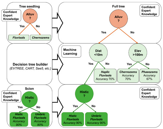 The proposed models for soil mapping were represented as decision trees. The main advantage of using decision trees is the possibility of intuitive manual correction. It is also possible to construct a seedling of a tree with branches that represent expert knowledge about soils (Figure 3). Such branches can be created to delineate large taxonomic groups of soils and specific soil properties. All unknown relationships can be extracted automatically via classification and regression tree algorithms, such as via the evolutionary learning of a globally optimal tree. The classification and regression tree algorithms should obtain an interpretable model. Consequently, this model needs to be compact and stable. After that, the full decision tree will contain all the required information for constructing the soil map (Figure 3). Such classification trees can be built for various soil regions and incorporated into a database to store the relevant knowledge of soils in a compact and explicit form. The obtained decision trees can also be linked to soil diagnostic features in soil classification systems to improve the soil classification systems or the decision trees themselves. Therefore, we considered two soil data sources: statistical knowledge in an interpretable form from decision trees extracted from legacy soil maps and expert knowledge from manual expert correction of the trees.