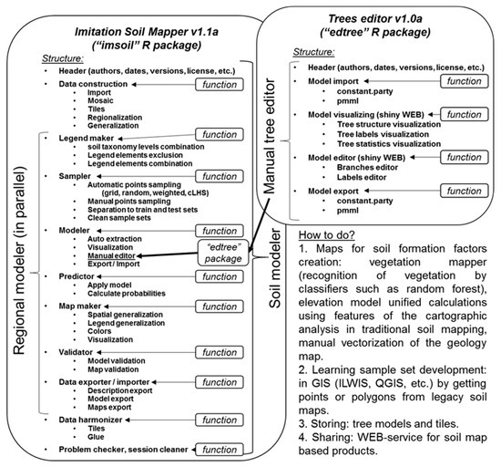 Using EVTREE as a method for finding the relationships between soil and soil formation factors, we implemented our approach of imitating the traditional soil mapping process in the R software packages (Figure 4). The main package, “imsoil”, was developed as a working experimental version. Development of the R package for the interactive manual correction of the “constparty” decision tree models from the “partykit” package was also required [46]. We used the model form “constparty” because it is widely used in various statistical packages and can be easily transformed into the classical format, “.pmml”.
