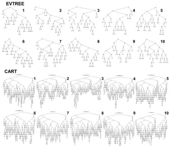 The appearance of the trees that were created via EVTREE and CART.