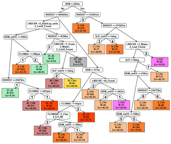 EVTREE quantitative decision tree №5 for the Chernozems soil zone in the Belgorod region (Soil Types: 3_G23—Greyic Phaeozems Albic, 5_CHv—Voronic Chernozems Pachic, 6_CHt—Voronic Chernozems Pachic, 10_CHrc—Leptic Chernozems, 20_CHtk—Leptic Voronic Chernozems Pachic, 21_AL—Umbric Fluvisols Oxyaquic, 22_GC—Gully Complex, 25_SAL—Haplic Fluvisols, N: number of the points with the soil, Err: misclassification rate).