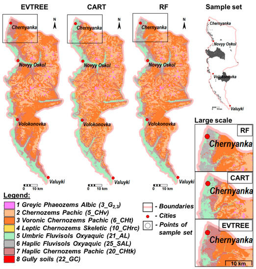 Sample set and soil maps that were created using the three methods: EVTREE, CART, and Random Forest.