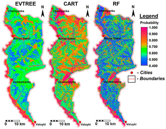 The overall accuracy of the soil map created via Random Forest using the full sample set was 87% (Table 5). Possibly, a part of the remaining 13% could be mapped using information about previous soil formation factors (soil formation factors such as the vegetation and climate that existed a thousand years ago could substantially affect the properties of soils but are not currently represented by covariates in digital soil mapping). The probability map created via the Random Forest algorithm demonstrated moderate quality, as the mean probability was 0.60 (Figure 8). Despite the moderate quality of the model, Random Forest correctly predicted 87% of the independent test sample set. The CART probability map showed a high mean probability of more than 80% for large areas, while the real prediction accuracy was only 67%. As in other studies, the Random Forest model demonstrated the best prediction accuracy for the full sample set [20].