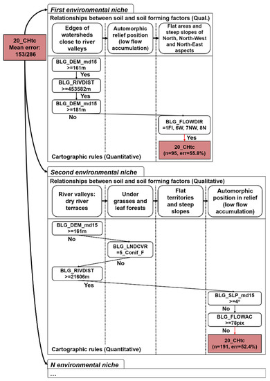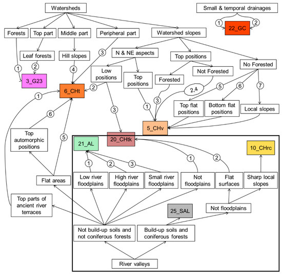 The obtained qualitative decision tree was represented in the form of separate rule chains for each soil. The rule chains were also split into environmental niches (Figure 10).