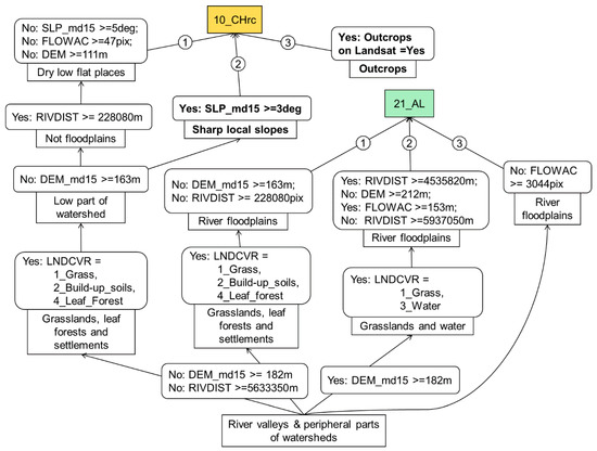 EVTREE_№5: DEM < 203 m ^ RIVDIST < 454,505 m ^ (1) LNDCVR = any except 2_Build-up_soils or 5_Coniferous_Forest ^ DEM_md15 < 160 m ^ RIVDIST < 23,679 m ^ 21_AL (Probability: 191/211); (2) LNDCVR = any except 2_Build-up_soils and 5_Coniferous_Forest ^ DEM_md15 >= 160 m ^ FLOWAC < 380 pixels ^ 21_AL (Probability: 33/64); (3) LNDCVR = 2_Build-up_soils or 5_Coniferous_Forest ^ ^ RIVDIST < 8398 m ^ 21_AL (Probability: 19/21).