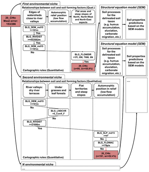 New approaches enable the combination of expert-based knowledge and mathematical modelling to fuse the quantitative and qualitative descriptions of the relationships between soils and soil formation factors. Structural equation modelling (SEM) is a contemporary approach that facilitates the integration of knowledge about soils into a statistical model and provides an opportunity to assess the inter-relationships of various soil properties during modeling [21]. According to the authors, “It bridges the gap between empirical and mechanistic methods for soil–landscape modelling and is a tool that can help produce pedologically sound soil maps” [12]. However, the SEM approach is more aimed at incorporating expert knowledge than extracting knowledge from legacy data. Moreover, full theoretical models of SEM are presently more complex than simply representing practical rules for soil delineation in the traditional soil mapping process.