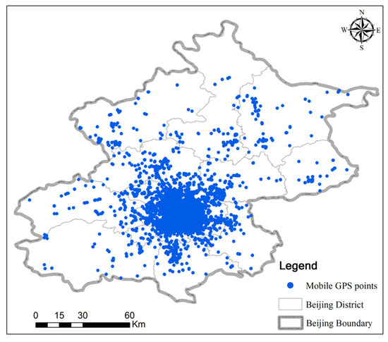 This paper adopts mobile phone GPS trajectory data of 182 voluntary participants from April 2007 to August 2012, which were collected via the Geolife project conducted by Microsoft Research Asia [23]. The data of Geolife mainly records the trajectory of a part of the staff of Microsoft Research Asia or their relatives and friends. It should be noted that the data coverred different periods of time. For instance, some data coverred one year, while other data coverred five years. The dataset record a wide range of outdoor activities of users, including life habits such as going to work and returning home and also entertainment and sports activities such as shopping, eating out, and hiking [24,25]. It is worth noting that 90.56% of the user trajectories are located in Beijing, and there are few trajectories in other cities. Therefore, this paper mainly focuses on Beijing. The attribute and distribution of the mobile phone data used is listed in Table 1 and shown in Figure 1, respectively.