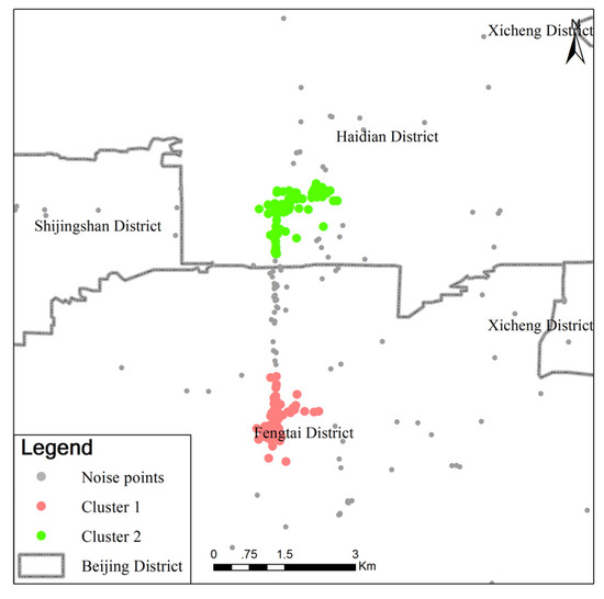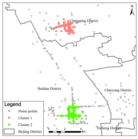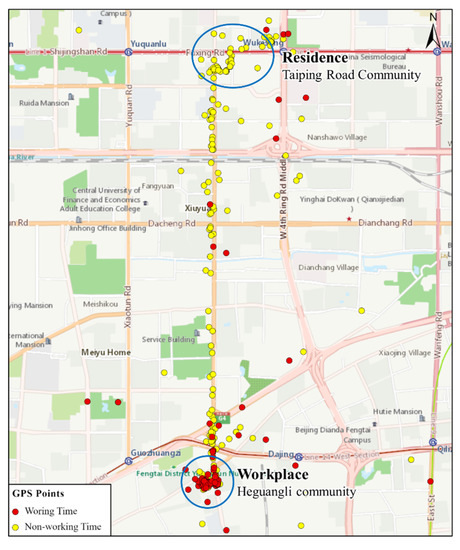 Figure 6 shows the clustering results, which has two cluster sets. Figure 7 shows the activity distributions of an individual on weekdays. It is noted that (1) for spatial distribution, the residence of the individual was located in the Taiping Road community, and the main workplace was located near the Heguangli community. The other workplaces occurred at different places in Beijing. (2) for the time characteristics, on weekdays, the individual left their residence at approximately 06:30 in the morning and arrived at their workplace at approximately 08:00 in the morning, and the commute time was approximately 1.5 h. They usually traveled along Qingta West Road. The activity frequency of occurrence at the residential place and working place are around 81.2% and 74.6%, respectively.