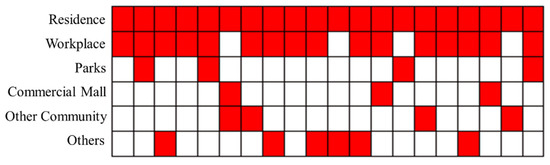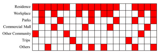 Figure 4b shows the activity distributions of the individual on their days off. Apart from their residence and workplace, the individual also often visited other places. According to the statistics of the individual’s travel behavior on their days off (Figure 5), it is found that the individual usually stayed home on their days off (besides any tourism undertaken), the activity frequency spent in the workplace accounted for approximately 40%, the activity frequency of going to park accounted for approximately 30%, and the activity frequency of going shopping accounted for approximately 20%. This individual usually traveled once every five weeks.