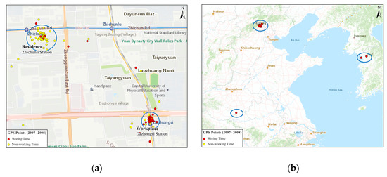 Figure 3 shows the clustering results, which has two cluster sets. Figure 4a shows the activity distributions of an individual on weekdays from 2007–2012. It is discovered that (1) in terms of the spatial distribution that one cluster is the residential place, the Huilongguan community, and the other clustering area is around the China Academy of Space Technology in Zhongguancun (workplace). (2) By analyzing the point frequency, the individual exhibited regular patterns of going to and leaving working. Normally, they left their residence at approximately 09:00 in the morning and arrived at their workplace before 09:30. The commute time was approximately 25 min, suggesting that the means of travel may be a bus or subway. However, they did not leave work at a fixed time, often worked overtime and arrived at their residence at approximately 09:00 in the evening. The activity frequency of occurrence at the residential place and working place are around 79.7% and 64.9%, respectively.