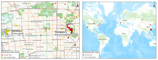 Figure 10 shows the activity distributions of the individual on weekdays from 2010 to 2012. It is discovered that (1) in terms of the spatial distribution, the core activity areas of the individual were located near Suzhou Street (residence) and the Southern Garden of Wanghe Park. (2) In terms of the time characteristics, the individual adhered to distinct regular patterns of going to and leaving work. The individual normally went to work at approximately 09:00 in the morning and finished work at approximately 17:00 in the afternoon. (3) It is worth noting that the individual remained active in various places, including Fujian, Hong Kong, and Taiwan in China and cities in Europe and North America. It is suggested that the individual may travel overseas for work.