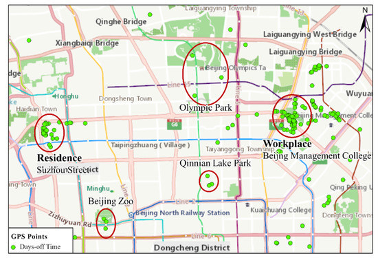 Figure 8 shows the activity trajectories of the individual on their days off and frequency statistics. It can be found that the trajectories were mainly distributed among various residences or workplaces, while the others occurred at tourist attractions (such as Yuanmingyuan and Qianlingshan), shopping malls, and other residential areas. The activity frequency that spent in the parks accounted for approximately 20%, and the activity frequency that going shopping accounted for approximately 15%. And this individual did not travel during the study periods.