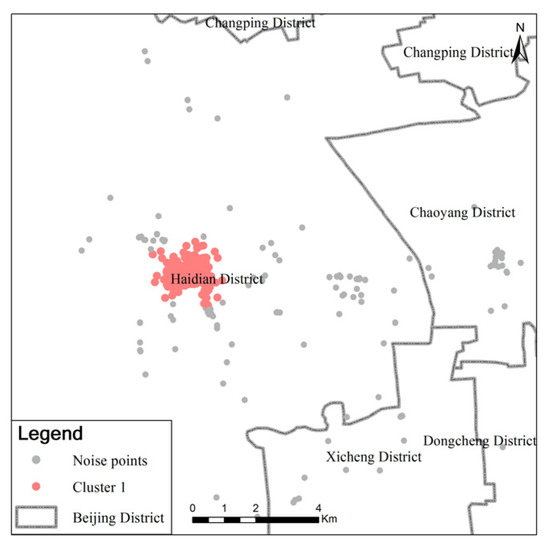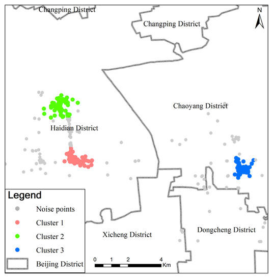 In this paper, the density-based spatial clustering of application with noise (DBSCAN) algorithm is employed to the clustering analysis. It is a typical density clustering method, which defines a cluster as the largest set of density-connected points [27]. DBSCAN can divide regions with enough density into clusters and determine clusters of arbitrary shape in noisy spatial data sets. The DBSCAN algorithm has advanced features that are useful when detecting patterns with different shapes and is also a good choice for the “natural” clusters and their arrangement within the data space [28]. Due to the advantage of DBSCAN, the basic DBSCAN algorithm became probably the most popular method for spatial clustering [29,30]. Therefore, for the spatial clustering method in this paper, the basic DBSCAN algorithm is used due to two reasons. One is the simplicity and reliability of this algorithm, and the other is that the spatial clustering analysis is one step of the proposed method. The main aim of clustering analysis in this paper is to determine the individual primary activity region not a precise function area using the basic DBSCAN algorithm to meet this need to some extent.