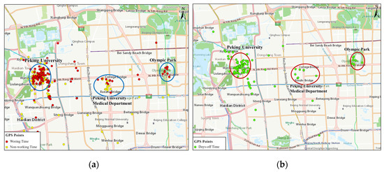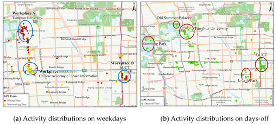 Figure 15a shows the activity distributions of an individual on weekdays from 2008–2009. It is found that (1) for the spatial distribution, the residence of the individual was located near the China Academy of Space Technology at the Zhichunli subway station, and the two core workplaces were Tsinghua University and Beijing University of Chemical Technology (BUCT). (2) For the time characteristics, there were no distinct patterns of going to and leaving work. The individual often arrived at their residence after 11:00 in the evening, and the commuting time from the Beijing University of Chemical Technology was approximately 30 min. The activity frequency of occurrence at the residential place, working place A and B are around 65.8%, 52.7%, and 38.9, respectively.