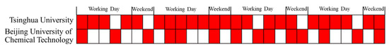 The frequency statistics of the activities at Tsinghua University and Beijing University of Chemical Technology are shown in Figure 16. The time spent at Tsinghua University (85%) exceeded that spent at BUCT (40%), so it can be deduced that the individual was a researcher at Tsinghua University but had a part-time job at the BUCT. However, the work frequencies at Tsinghua University and Beijing University of Chemical Technology were essentially the same on their days off.