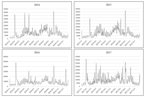 This research aims to investigate the effect of seasonal changes on tourist flow on the subsequent day. The daily tourist flow at scenic destinations varies dramatically over the different seasons, primarily because of the differences in temperature. In this part, the year is assumed to be divided into four seasons following the meteorological department’s scheme: spring (March, April, and May), summer (June, July, and August), autumn (September, October, and November), and winter (December, January, and February) [15]. Figure 2 illustrates the distribution of the daily tourist flow on the subsequent day at Mountain Huangshan over the period of 2014 to 2017.