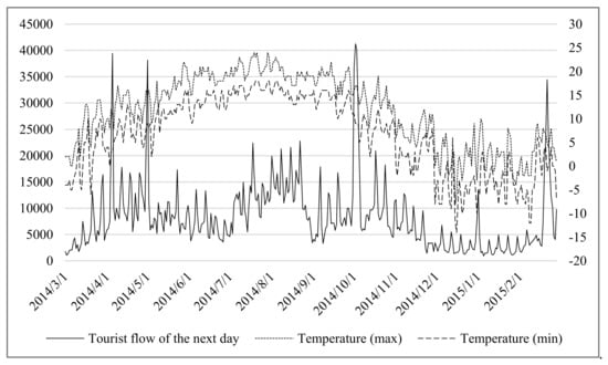 Daily tourist flow, along with the maximum and minimum daily temperatures, during March 2014 to February 2015.