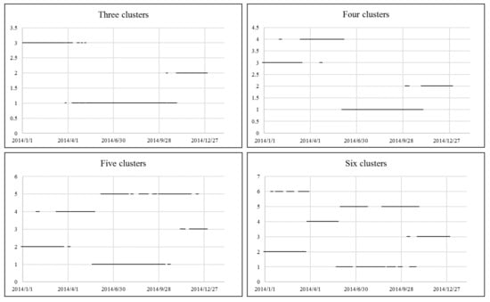 In the figure, we use the number 1 to represent cluster 0, number 2 for cluster 1, number 3 for cluster 2 and so on. As is evident, when the year is divided into three seasons, some sample points are clustered into very few clusters. When it is divided into five classes, some objects belong to more than one category. However, when it is divided into six classes, only a few objects belong to each class, which is insufficient to form a category. Table 5 and Table 6 present the specific clustering results for the cases of three and four classes.