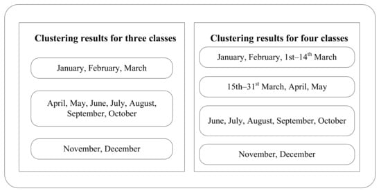 To facilitate the presentation of the clustering results, Figure 5 is designed, from which it can be concluded that when the year is divided into three categories, April, May, June, July, August, September, and October are clustered into a single category. However, during April to October, the temperature initially increases and then decreases, affecting the daily tourist flow accordingly. After repeated trials, the results confirm that a stable state is reached when the year is divided into four seasonal classes. The final result is also presented in Figure 5, in which January, February, and 1–14 March is taken to constitute one class. During this time, the temperature is relatively low, and the daily tourist flow remains almost identical throughout the period. However, in late March, the temperature begins to gradually increase, and the climate becomes more comfortable. Thus, the daily tourist flow at mountainous destinations during this time is similar to that of April and May. Therefore, early March is classified in the same category as January and February, whereas late March is now classified in the same category as April and May. Similarly, in June, July, and August, although the surface temperature is relatively high, the temperature in mountainous spots remains relatively low; and so, they are grouped together with September and October into a single class. Meanwhile, November and December define their own category.