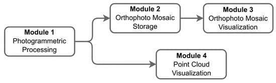 The conception of a web application for manipulation, analysis, and visualization of UAV-based imagery outputs requires four modules. Module 1 is responsible for the photogrammetric processing, receiving as inputs the images collected by UAVs and producing as outputs an orthophoto mosaic and a 3D dense point cloud. Next, Module 2 is used to store the orthophoto mosaic in a map server. This module receives as input the orthophoto, generated in Module 1, and makes available several web services for geographical data publishing. Module 3 is responsible for orthophoto mosaic visualization, using a Web Map Service (WMS) layer as input and produces a web-mapping page for orthophoto visualization as output. Finally, Module 4 deals with dense point cloud visualization and analysis. This module receives the point cloud data, provided by Module 1, and builds a webpage for its visualization. Figure 1 presents the flowchart of the modules.