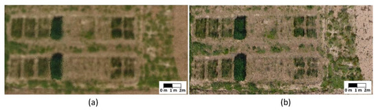 Considering the first study area, the orthophoto mosaic generated (Figure 8a) was created with a Ground Sampling Distance (GSD) of 1.78 cm, making it possible to visualize the surveyed area with great detail. Regarding the second study area, a lower spatial resolution was obtained on the orthophoto mosaic (Figure 8b) with a GSD of 3.70 cm. Considering the orthophoto mosaic observations, problems in transition areas were not noticeable in the region of interest, as it is not presenting displacement areas, and verifying a good balance in brightness levels in both cases. However, outside the region of interest, where a fewer number of images were acquired, some radiometric or coloring variations are more noticeable close to the borders. These issues were already observed in other studies [39].