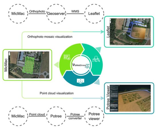 As a result, considering the aforementioned advantages, the aim of the proposed research is to present VisWebDrone (visual web platform for drone-based imagery analysis), a web application for UAV photogrammetry based on open-source technologies. The proposed solution will be maintained as a free and open-source platform, available on GitHub, relying on the users contribute. The web application is composed of several pieces of open-source software that are completely integrated, combining the data-processing stage with the graphical presentation of the results. The data-processing stage is performed using MicMac, while the graphical presentation of the results is provided by Leaflet and Potree. Several Graphical User Interface (GUI) solutions, integrating MicMac, have already been developed. Among the solutions developed, the CEREMA (Centre d’études et d’expertise sur les risques, l’environnement, la mobilité et l’aménagemen) has released the AperoDeDenis, a GUI for MicMac that is under development. Another GUI, the InterfaceMicmac, developed by IGN (Institut national de l’information géographique et forestière) was discontinued. Recently, Alessio Calantropio of Politecnico di Torino developed the GEMINI (Graphically Enhanced MicMac’s New Interface) solution, which is focused on the quality assessment of the achieved results [18]. Although all GUI solutions presented applied the abstracting command line provided by MicMac software, none of them has available graphical solutions for the manipulation and visualization of the achieved results, using photogrammetric processing (e.g., visualization of orthophoto mosaics and point clouds). VisWebDrone intends to fill this gap, providing the appropriate tools for this purpose.