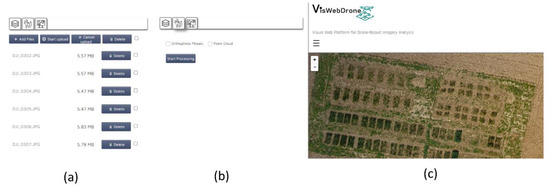 The web application interface intends to promote a user-friendly experience, presenting a simple, intuitive, and clean design. VisWebDrone is composed of a section to select and upload images collected by UAVs (Figure 4a), a section to select the type of output to process (Figure 4b)—orthophoto mosaic, point cloud, or both—and another section to visualize the results of photogrammetric processing (Figure 4c).