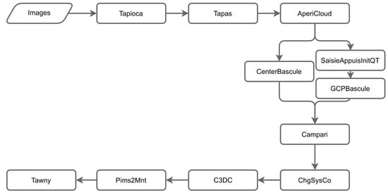 MicMac implements photogrammetry based on SfM algorithms, consisting of two successive steps. The first step is related to the detection and matching of automatic tie points while the second step is associated with the bundle adjustment that corresponds to the computation of viewpoints relative locations (camera positions) [33]. These steps are integrated in MicMac tools, presented in Figure 4. MicMac is very flexible, offering several tools that can be selected to define a complete and appropriate workflow. The workflow used for imagery processing (Figure 5) is based on the following steps: