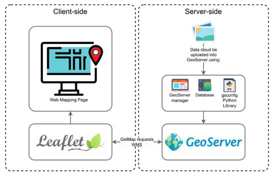 The communication between Leaflet (client side) and GeoServer (server side) is performed through the use of GetMap requests that are used to load the geospatial data, stored in server, into the web-mapping page (Figure 6). The specifications of GetMap requests are defined by Leaflet library, using the WMS standard that is based on HTTP methods [36].