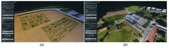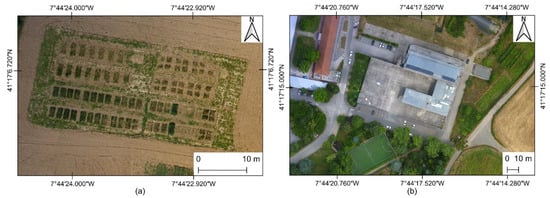 To explore and test the web application functionalities, two study areas, with data collected from UAV, were selected and are presented in this section. The data were collected on the campus of the University of Trás-os-Montes e Alto Douro, Vila Real, Portugal. The first study area is related to a set of agronomical trials, while the second includes building areas (Figure 7). The idea behind this selection is to evaluate the performance of the solution in rural environments, where geometric entities are scarce and in semi-urban environments, where the existence of these geometric structures has the potential to improve the performance of these solutions, as they are easily recognizable. Thus, the performance of the proposed application can be tested in most common application cases.