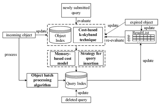 Definition 6 (k-skyband/Extended Result list). Given , for any incoming object , we insert it into the k-skyband only if: (1) loosely matches ; (2) is dominated by less than other objects. For, ifan object loosely matches , and there are objects in dominating,would not be a result at any timestamp. Therefore, we would not insert these objects into the result list.