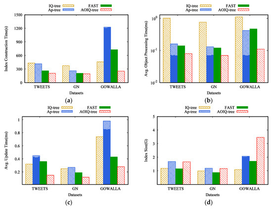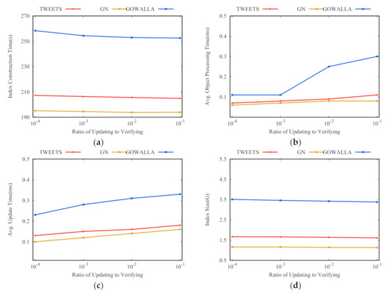 Theorem 3 shows all the cases where the verification costs increase if a query is inserted into the posting list. The increase of update costs corresponding to the above four cases are , , , and respectively. To compare the verification costs and update costs, we introduce a normalization parameter to represent the ratio of the update operation to the verification operation, i.e., if a query is inserted into a node, there will be objects being verified with it. A query is adaptively inserted into the posting list according to the following theorem. □