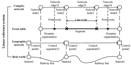On this basis, the geographic railway network model constructed in this paper is shown in Figure 1 and is divided into three layers: the first layer is the train operation network, created based on the complex network model, and is mainly used to study the topological characteristics of the train operation network; the second layer is a connection layer based on the linear reference system which maps the train operation network to the actual geographic railway network by means of events; and the third layer is the geographic network, composed of actual railway lines and providing the location basis for train operation.