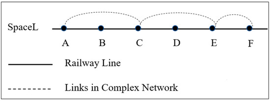 The types of Chinese railway trains mainly include high-speed train, bullet train, non-stop train, express and fast train. According to speed, trains are divided into two types: high-speed and normal-speed trains, among which, high-speed and bullet trains are in the same group, while the rest of the non-stop trains, express trains and fast trains are in the other group. This paper used SpaceL method to establish two different Geographic Railway Network mentioned above. SpaceL modeling takes railway stations as nodes, and there is a connection edge between two nodes that the same train continuously stops on its travel line [26,27], as shown in Figure 2.