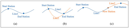 Figure 3. Line information of the station. (a) Only one line connecting the station node pair. (b) Two lines connecting the station node pair. (c) No corresponding line passing between the station node pair. - (2)