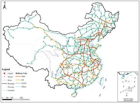 Railway transportation, as the main artery of the national economy and one of the major means of transportation in the comprehensive transportation system, is characterized by huge carrying capacity, low operation cost, safety and punctuality, and low energy consumption [1,2,3]. In recent decades, China has actively implemented the strategy of building a sound railway transportation infrastructure, and has rapidly constructed a modern normal-speed railway network and a developed high-speed railway network. In 2004, the State Council approved the first “Medium and Long-Term Railway Network Planning” in the history of Chinese railway, which depicted a blueprint for a “four vertical and four horizontal” high-speed trunk network. In 2016, the revised “Medium and Long-Term Railway Network Planning” outlined a grand blueprint for an “eight vertical and eight horizontal” high-speed railway network [4,5]. In the meantime, the normal-speed railway has also undergone a speed-up transformation, electrification transformation and double-track transformation. As a result, the railway network coverage in the central and western regions has been expanded and the network layout in the eastern region has been optimized [6,7]. According to statistics, by the end of 2019, China’s railway operating mileage had reached 139,000 km, of which the high-speed railway operating length reached 35,000 km, ranking first in the world [8]. With the planning, construction and operation of more railway lines, the railway network is becoming better and better, and the network scale is also expanding and making the network structure increasingly complex [9,10]. The complex network system does improve the operation efficiency of the whole network, but it has, meanwhile, brought various challenges [11,12].