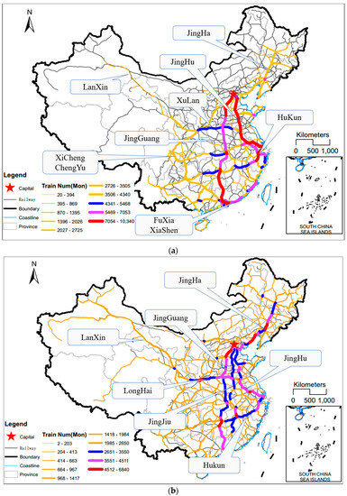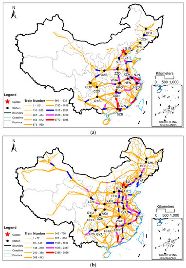 According to the linear reference and dynamic segmentation technology, the railway network is mapped onto the actual geographic network to obtain an analysis of spatial distribution characteristics of the geographic railway network, as shown in Figure 5. Figure 5a is the geographic network of high-speed railway. High-speed railway lines are mainly concentrated in the eastern and central regions in China. Figure 5b is the geographic network of normal-speed railway. The geographic network of normal-speed railway covers a wider range, especially in the northern and western regions where the coverage of high-speed railway is insufficient, and plays an important role in passenger transportation. Lanzhou-Xinjiang Railway in the west region is the main railway connecting Xinjiang to mainland China, and a main component of the railway network in Northwest China.