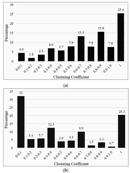 Percentage distribution of clustering coefficients of the geographic railway network. (a) Clustering coefficients of the high-speed railway network. (b) Clustering coefficients of the normal-speed railway network.