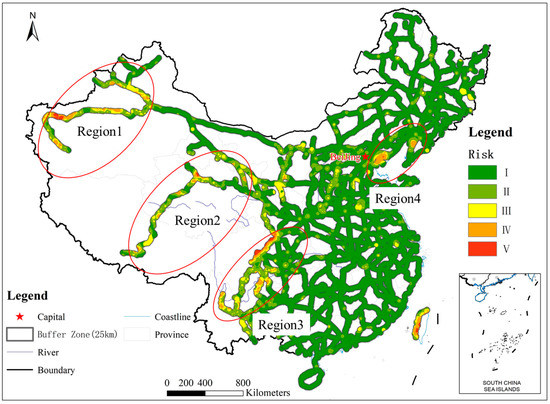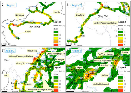 The maximum possible destruction range under different seismic magnitude is calculated by the seismic attenuation equation. The equivalent intensity value at different positions in the geographic railway network is obtained through overlap analysis of the network in ArcGIS to measure the degree of seismic impact. Moreover, historical seismic point (ms ≥ 4.5) is used to calculate kernel density value which is classified into four levels by the natural fracture method to measure the possibility of earthquakes in different regions. As a result, equivalent intensity value and kernel density value are superposed to obtain the hazards diagram of the geographic railway network under earthquake disasters, and it is classified into five levels, as shown in Figure 9. Type I hazardous zone indicates that the railway line will be hardly influenced by the earthquake. Type II hazardous zone indicates that the railway line will be influenced by the earthquake, but degree of impact and possibility of earthquake are relatively low. Type V hazardous zone indicates that the railway line is susceptible to earthquake disasters and seismic destruction degree is very high. Type III & IV hazardous zones indicate conditions between the two. The railway lines in the geographic railway network that are greatly affected by the earthquake are mainly located in northwest, southwest, northeast and northern China, corresponding to Region 1, Region 2, Region 3 and Region 4 in the Figure. Besides which, the impacts are relatively small in southeast region.