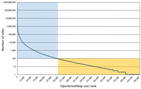 In addition, we can mention OpenStreetMap (www.openstreetmap.org), as a well-known VGI project where participation inequality among volunteers has been discussed several times [35,36]. Wood’s analysis [37] illustrated that only a small number of participants among the registered users (about 150,000 out of 2 million registered users at the time of analysis) contribute more than 100 points of data (Figure 2). This pattern has persisted until now, since OpenStreetMap statistics show that only 1% of all users contribute regularly [38]. Wood also noted that it is essential to understand how to recruit new participants, and to encourage registered participants to contribute (make edits) and active participants to continue with their contributions (Figure 3).