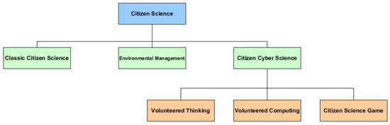 As stated in the introduction, the motivation of CS participants differs according to the typology of the CS project. We can therefore ask the question, “How are CS projects classified?”. Several classifications for CS projects are defined according to the types of volunteer contribution to science [1,14,42]. In this article, we looked at Haklay’s classification [14], in which he categorises CS projects into three types: classic citizen science, environmental management, and citizen cyber-science (CCS).