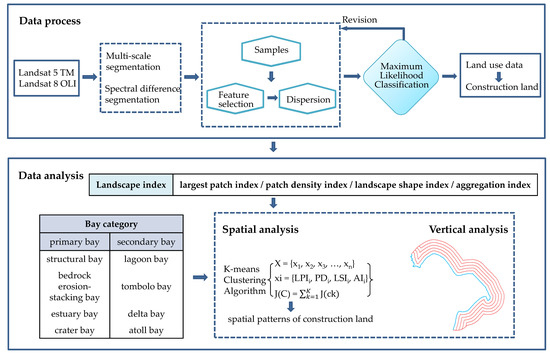 The research diagram flow was described in Figure 2. First, we acquired the construction land data from Landsat images. Then, we introduced the method of landscape ecology and analyzed the spatial distribution of construction land in two aspects. In the spatial analysis, the K-means clustering algorithm was used to identify the spatial pattern of construction land distribution. In vertical analysis, the method of coastal buffer division was used to analyze the landscape features of construction land in the sea–land direction. Moreover, the influence of bay type on the spatial and vertical distribution of construction land was discussed.