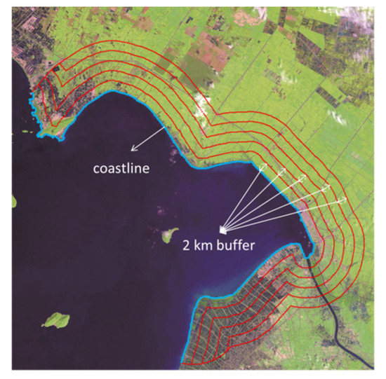 Finally, the buffer zone was cut by using the coastline and boundary lines to obtain buffer strips of 0–2 km, 2–4 km, 4–6 km, 6–8 km and 8–10 km on the landward side.