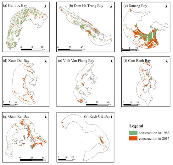 Spatial distribution of construction land in bays. (a) Hai Loc Bay; (b) Dam Ha Trung Bay; (c) Danang Bay; (d) Xuan Dai Bay; (e) Vinh Van Phong Bay; (f) Cam Ranh Bay; (g) Ganh Rai Bay; (h) Rạch Giá Bay.